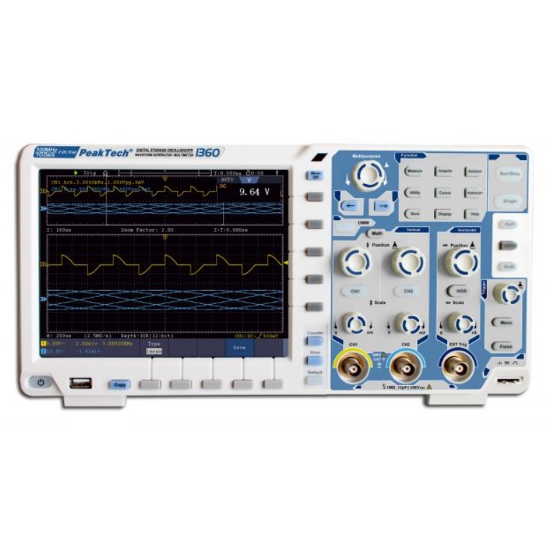 Osciloscop, Multimetru, Generator de unde de forme arbitrare, 2 can, 100 MHz, 2GSa/s, TouchscreenPeakTech 1360