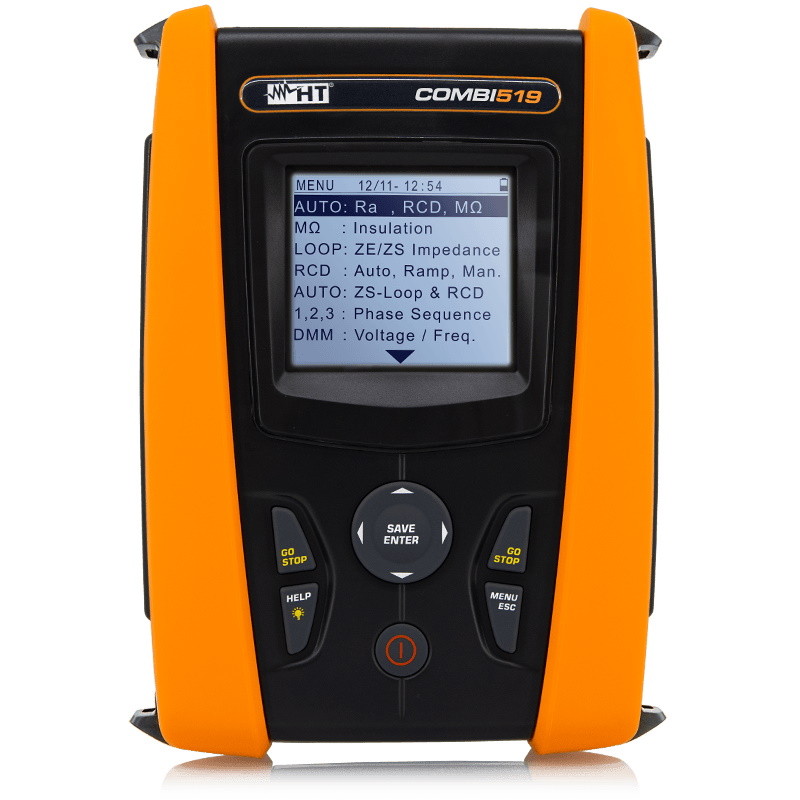 COMBI519 carries out tests on electric systems in compliance with IEC/EN 61557-1 and therefore measurements of continuity of the protection cable, insulation resistance (with calculation of PI and DAR), overall earth resistance, RCDs type B, A and AC tripping time and current, line / fault impedance with calculation of prospective short circuit / fault current, phase sequence and conformity.