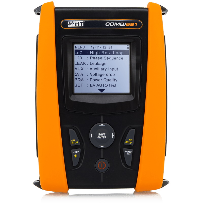 COMBI521 carries out tests on electric systems in compliance with IEC/EN 61557-1 and therefore measurements of continuity of the protection cable, insulation resistance (with calculation of PI and DAR), overall earth resistance, RCDs type B, A and AC tripping time and current, line / fault impedance with calculation of prospective short circuit / fault current, phase sequence and conformity.