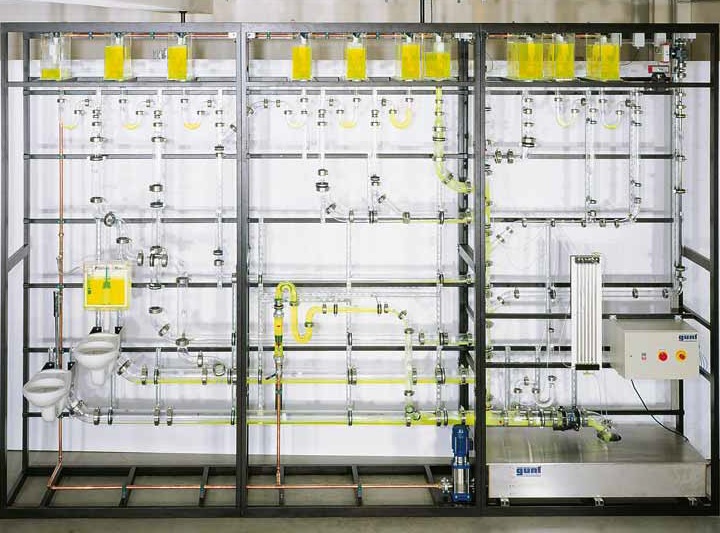 Demonstration of key aspects of wastewater technology. Piping systems: transparent piping system allows view of the inside to observe the flow conditions. Safety and hygiene of drinking water pipes Pipe flushing according to DIN 1988 standards; how contaminants can be introduced Drinking water installation in domestic setting with all common components