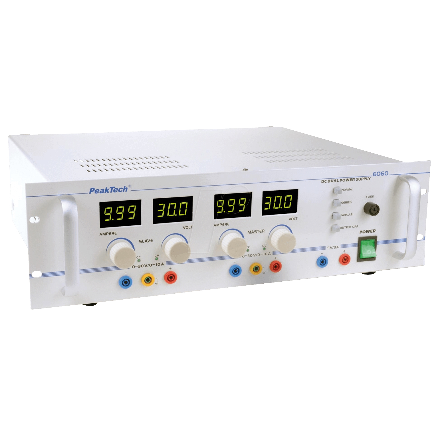 Sursa duală lineară 2 x 0 - 30 V/2 x 0 - 10 A, 5 V/3 A fixă - Peaktech P6060P6060